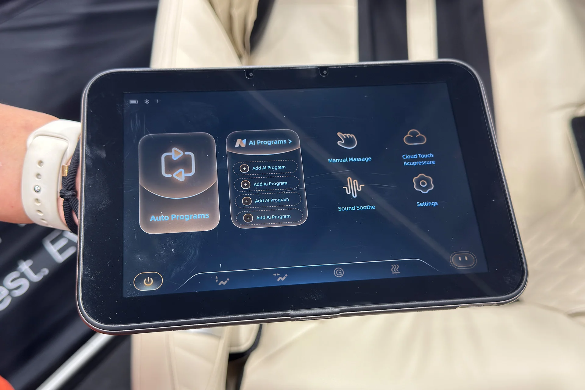 Do lado direito da cadeira havia um pill para iniciar ou configurar sessões de massagem. A empresa diz que você também pode usá-lo para conversar com IA, dizendo coisas como que tipo de massagem você deseja, mas isso não funcionou durante minha demonstração – o representante do estande disse que eles tiveram que mantê-lo desativado devido ao Wi-Fi ruim, pois é um modelo de IA baseado em nuvem.