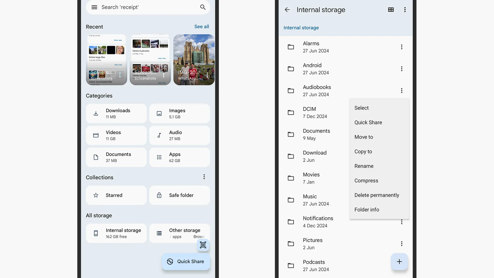 Mais abaixo na tela, você pode acessar todas as pastas do seu arquivo através do Armazenamento interno botão e todas as contas de armazenamento em nuvem que você conectou ao Android por meio do Outro armazenamento botão. Também há acesso ao seu Pasta segura aqui, que é uma pasta especial que você pode proteger com um PIN e usar para armazenar arquivos particularmente confidenciais.