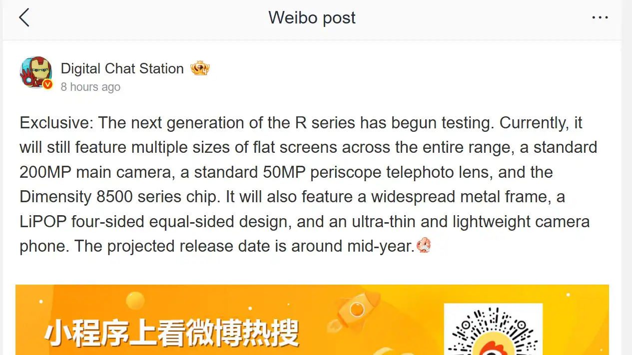 Tipster Digital Chat Station no Weibo afirma que a próxima geração da série R da Oppo entrou em fase de testes e será lançada em meados do ano. O informante não nomeia diretamente a programação, mas a seção de comentários sugere que se trata da série Reno 16. Diz-se que a próxima linha será lançada com telas planas com vários tamanhos em variantes, assim como os modelos mais recentes da empresa.