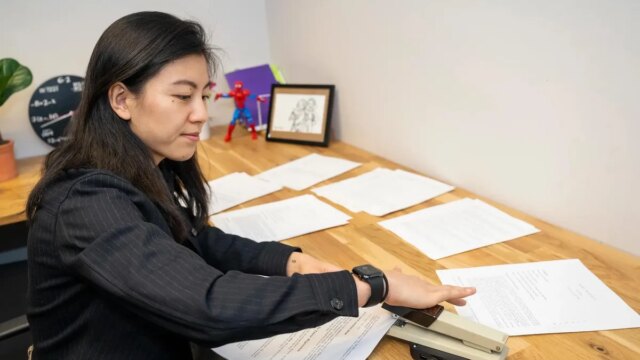 Violet Han usa um grampeador conectado a uma plataforma controlada por modelos de IA.