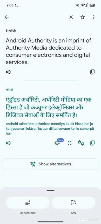Assim que for implementado, os usuários deverão ver um novo botão “Mostrar alternativas” abaixo do resultado traduzido, conforme mostrado nas capturas de tela anexadas. Tocar neste botão revela três traduções alternativas ligeiramente diferentes.