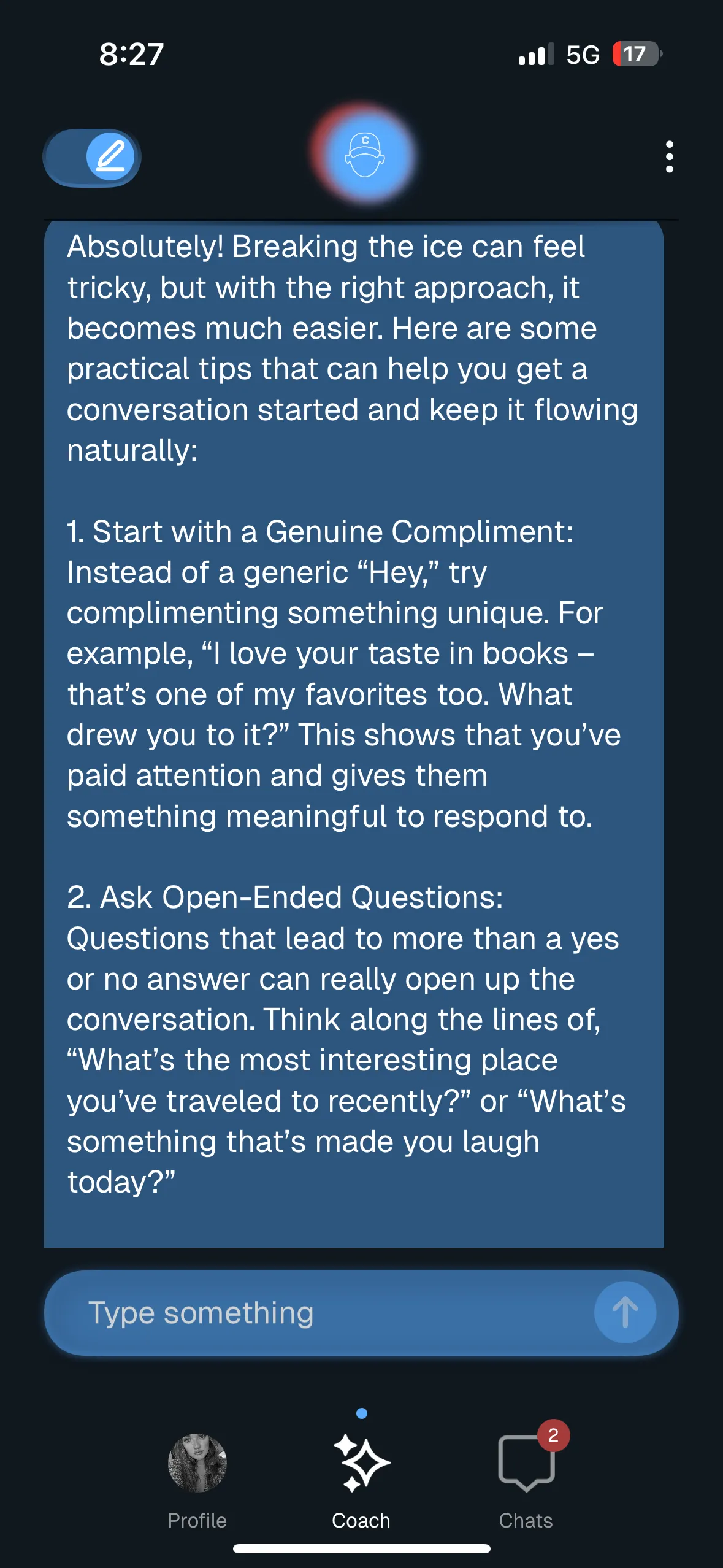 Pedi dicas de como quebrar o gelo com fósforos novos e ele me deu conselhos, cada ponto com um parágrafo explicativo abaixo. Os conselhos incluíam elogiar, fazer perguntas abertas, usar o humor, fazer referência a eventos atuais, compartilhar sobre você e mencionar interesses mútuos. O conselho foi básico, mas sólido, e refletiu o que o treinador estava fazendo com as instruções de conversa fornecidas.
