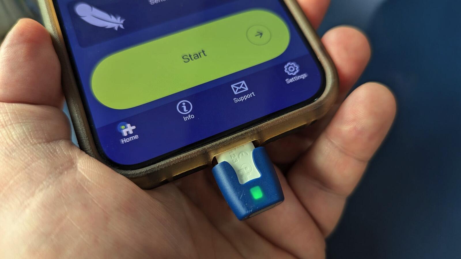 Veja como funciona. Primeiro, você baixa o aplicativo para o seu telefone (ambos iOS e Android versões estão disponíveis), conecte o dongle ao seu smartphone (há um USB-C para Android e iPhones mais recentes e um Versão Lightning para iPhones mais antigos), use o aplicativo para aquecer a extremidade do dongle a um máximo de 124°F/51°C, em seguida, pressione a extremidade na mordida e espere o cronômetro indicar que o tratamento foi concluído.