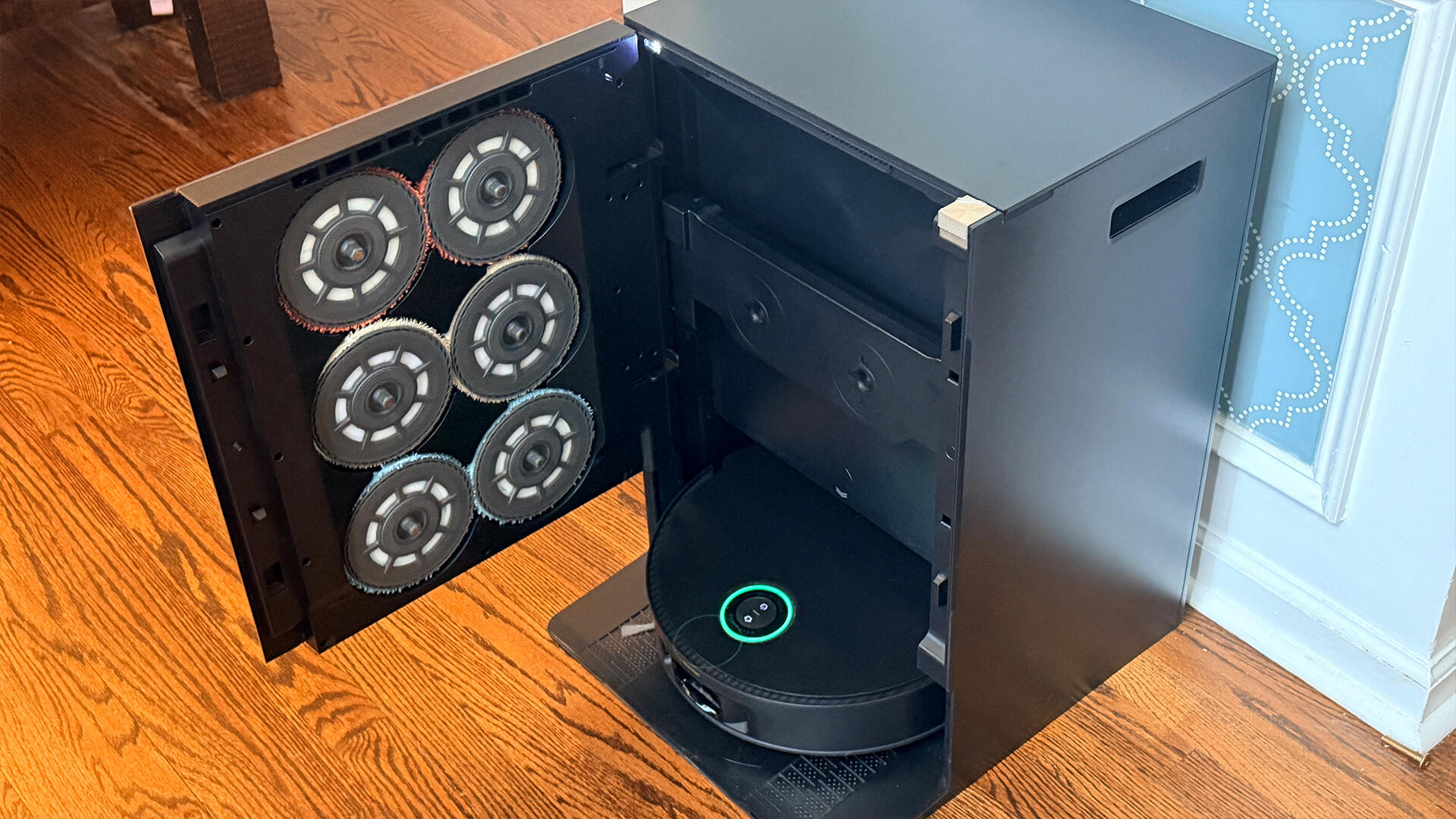 Na doca, os esfregões giram dentro da porta e você nunca precisa tocá-los. O robô irá acoplar, lavar os esfregões, secá-los, retirá-los e depois guardá-los.