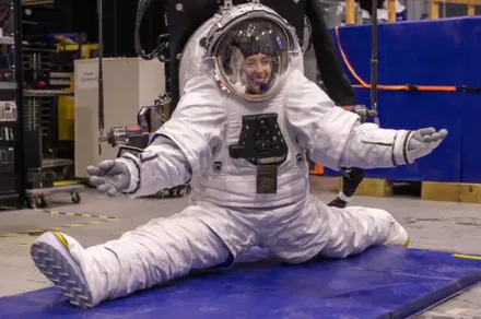 “O AxEMU oferece mobilidade nunca vista antes”, diz Axiom Area em comentário sobre o vídeo. Para deixar claro, a empresa inclui uma foto de alguém fazendo espacates no novo traje espacial.
