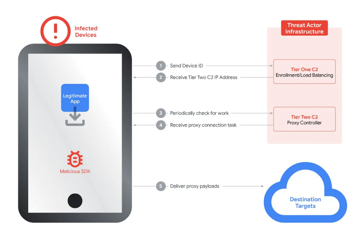 Redes proxy residenciais são frequentemente usadas por invasores para mascarar comportamentos maliciosos, como preenchimento de credenciais, extração de conteúdo, invasão de contas e outras formas de fraude. Como o tráfego parece vir de endereços IP domésticos ou móveis, pode ser mais difícil para os sistemas de segurança distinguir usuários legítimos de tráfego ilegítimo. O Google disse que, junto com seus parceiros, identificou a rede, que usou uma variedade de técnicas para evitar a detecção, incluindo a execução de serviços ocultos em dispositivos e o obscurecimento de canais de comando e controle.