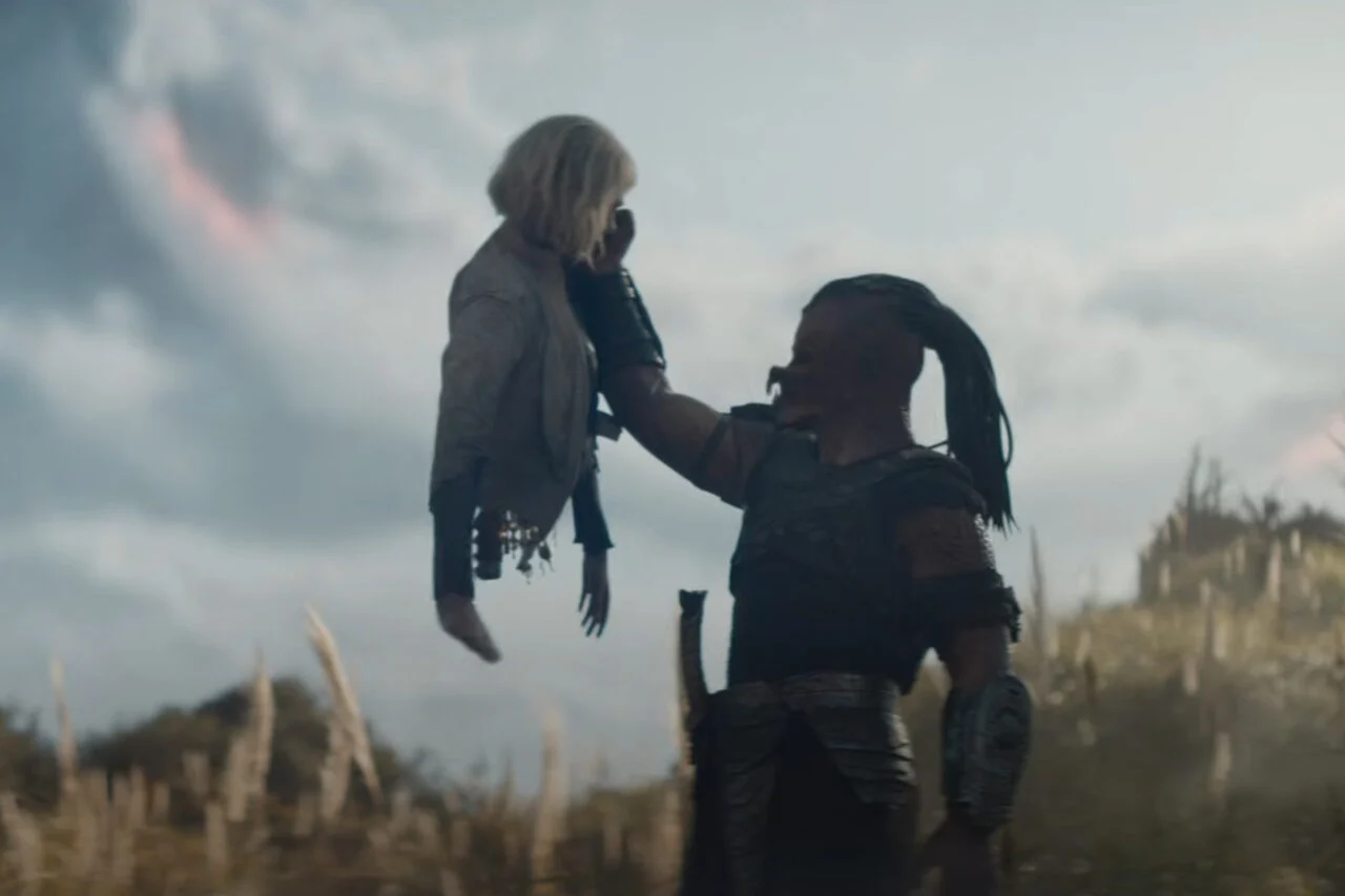 O que você vê aqui é uma imagem do filme Predador: Badlands. É de um Predador chamado Dek (Dimitrius Schuster-Koloamatangi), segurando a metade superior de um ser sintético chamado Thia (Elle Fanning). É de um filme classificado como PG-13 nos EUA e não contém uma gota de sangue humano. Agora, essa imagem te assusta? Isso te ofende? Você acha isso “inapropriado” ou “perturbador?” Se a resposta a alguma dessas perguntas for “sim”, você ficará muito feliz.