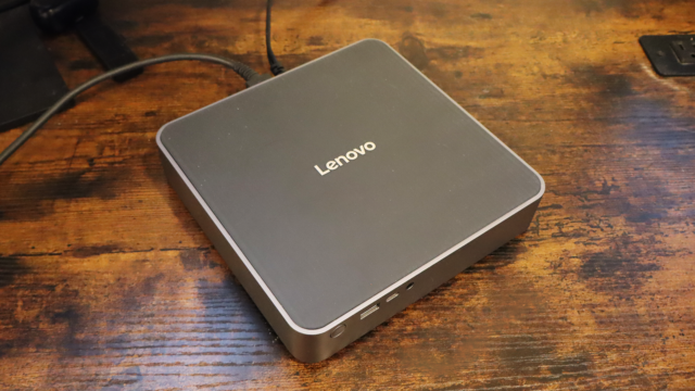 Comparado com outros mini PCs que testei, este dispositivo é um pouco maior, medindo 1,68 x 7,68 x 7,52 polegadas e pesando pouco menos de dois quilos. Isso me lembra muito os antigos Mac Minis antes do redesenho. Não ocupa muito espaço, mas se você achar que é grande demais para sua mesa, a Lenovo inclui um pequeno suporte vertical que mantém o computador na posição vertical.