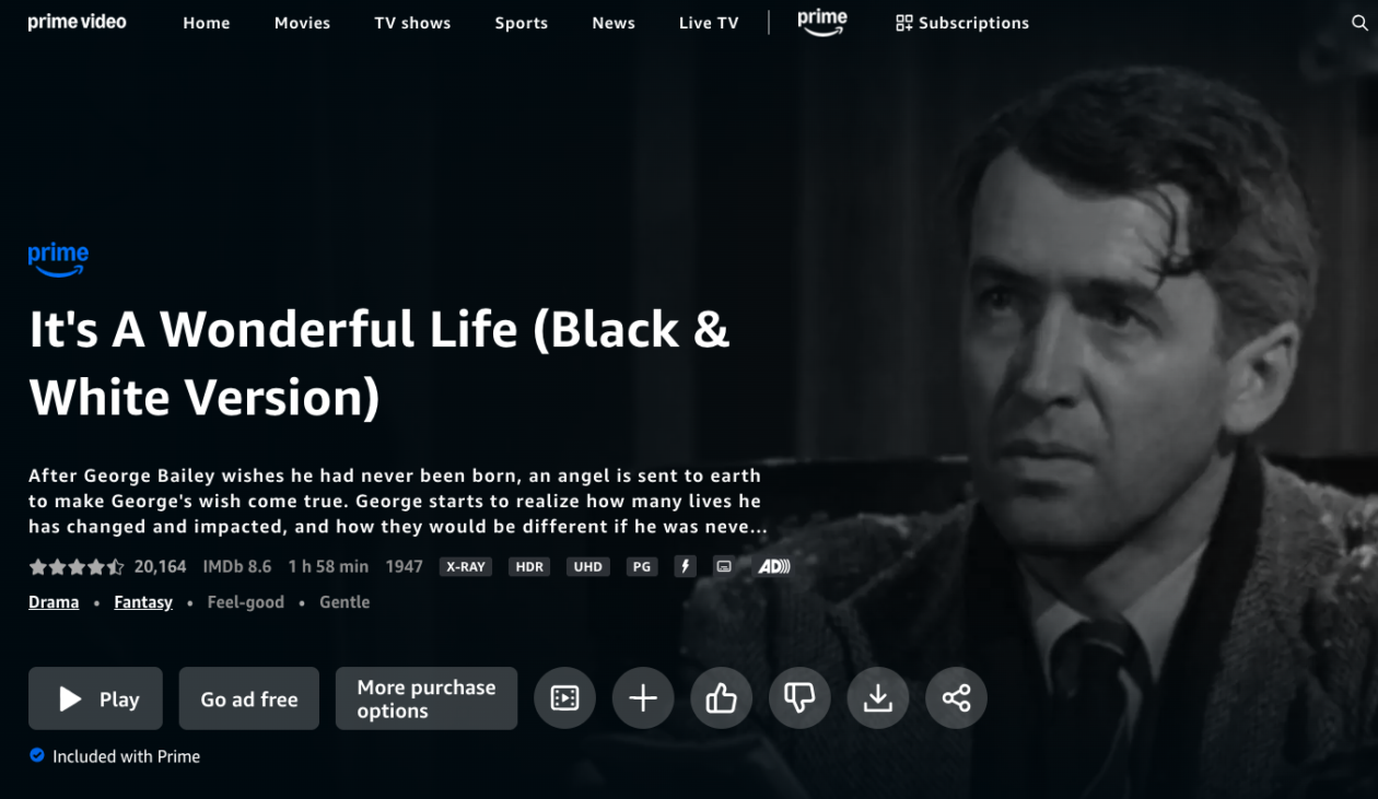 Uma pesquisa pelo título do filme no Prime Video na manhã de segunda-feira trouxe algumas opções, incluindo uma versão em preto e branco, uma versão colorida e uma claramente marcada como “resumida”. Essa versão incluía uma descrição que dizia, em parte, “um closing condensado, mas ainda contém toda a doçura e maravilha do Natal”.