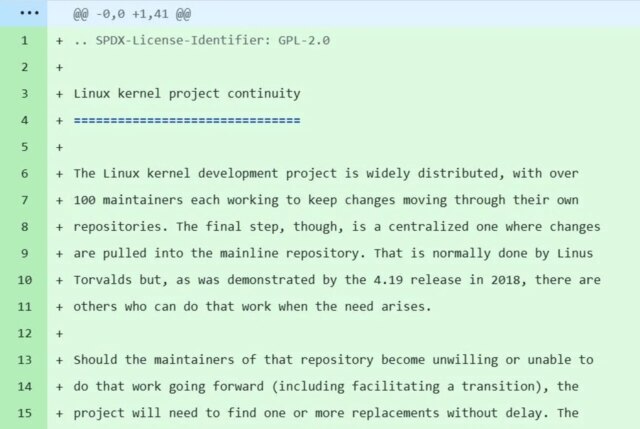 O documento enquadra isso como uma forma de proteção contra o clássico problema do “fator barramento”. Ou seja, o que acontece com um projeto se seu líder for atropelado por um ônibus? O papel central de Torvalds hoje significa que o projeto atualmente assume um fator de barramento de um, onde a saída de uma única pessoa poderia, em teoria, desestabilizar fusões e liberações finais. Na prática, como Torvalds e outros mantenedores de topo discutiram, o trabalho de pinguim de topo quase certamente iria atualmente para Greg Kroah-Hartman, o mantenedor do kernel Linux do ramo estável.