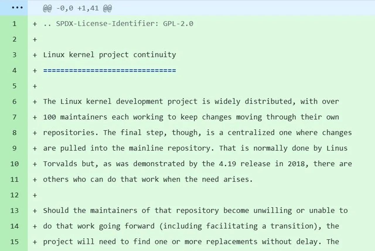 Torvalds respondeu: “Mas a questão é que Greg nem sempre foi Greg. Antes de Greg, havia Andrew Morton e Alan Cox. Depois de Greg, haverá Shannon e Steve. A verdadeira questão é que você precisa ter uma pessoa ou um grupo de pessoas em quem a comunidade de desenvolvimento possa confiar, e parte da confiança é fundamentalmente sobre ter existido por tempo suficiente para que as pessoas saibam como você trabalha, mas tempo suficiente não significa ter 30 anos. “