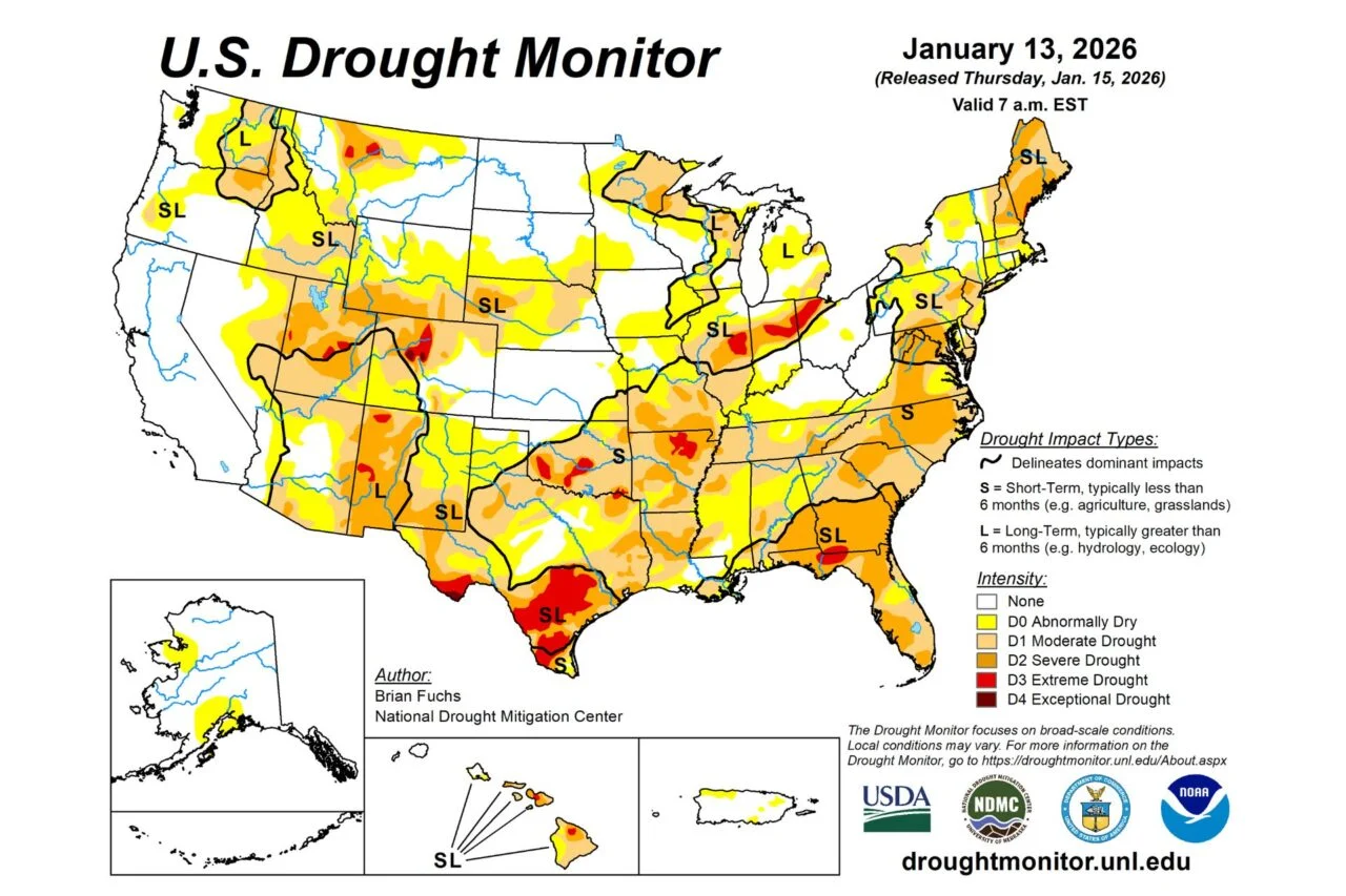 Avançando para janeiro de 2026 – as condições não parecem melhores. Em 13 de janeiro, 39 estados, do Maine ao Havaí, enfrentavam condições de seca que variavam de severas a excepcionais, de acordo com Seca.gov. Naquela altura, estas condições cobriam 35,66% dos EUA e Porto Rico, ou 42,55% dos 48 estados mais baixos.