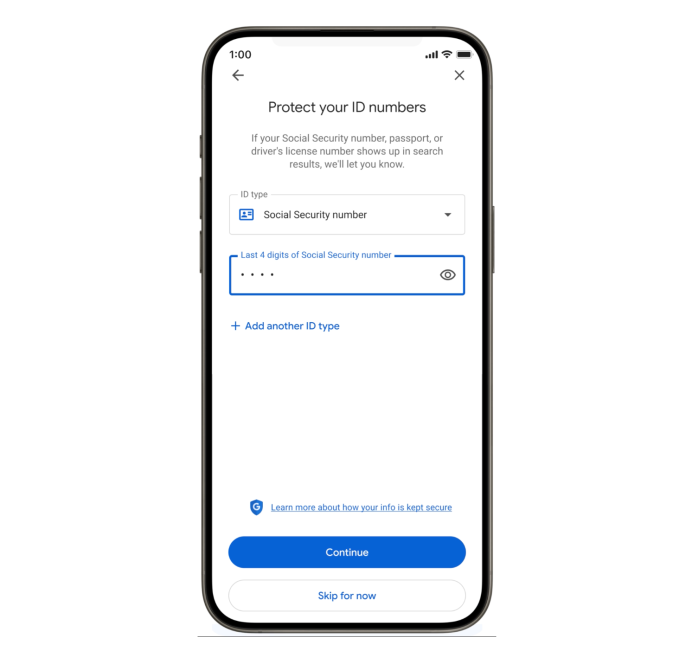 A ferramenta “Resultados sobre você” já permite aos usuários remover resultados de pesquisa que contenham seu número de telefone, endereço de e-mail ou endereço residencial, e agora também pode ser usada para solicitar a remoção de resultados que incluam informações como carteira de motorista, passaporte ou número de Seguro Social, informou a empresa na atualização de terça-feira.