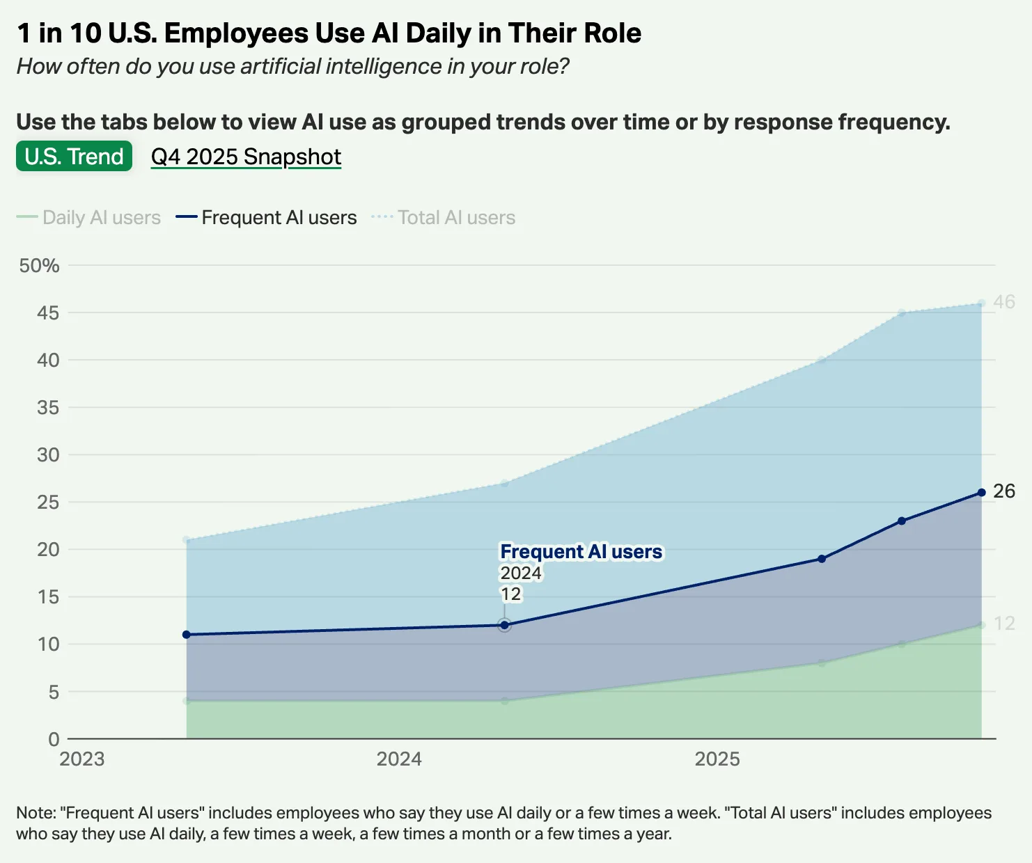 Um novo Pesquisa Gallup sugere que a realidade dentro dos locais de trabalho é bem diferente. De acordo com a última pesquisa da Gallup sobre a força de trabalho, apenas 12% dos adultos empregados nos EUA afirmam usar IA todos os dias no trabalho. Cerca de um quarto usa-a com frequência, ou seja, algumas vezes por semana, enquanto quase metade deles afirma usar IA apenas algumas vezes por ano.