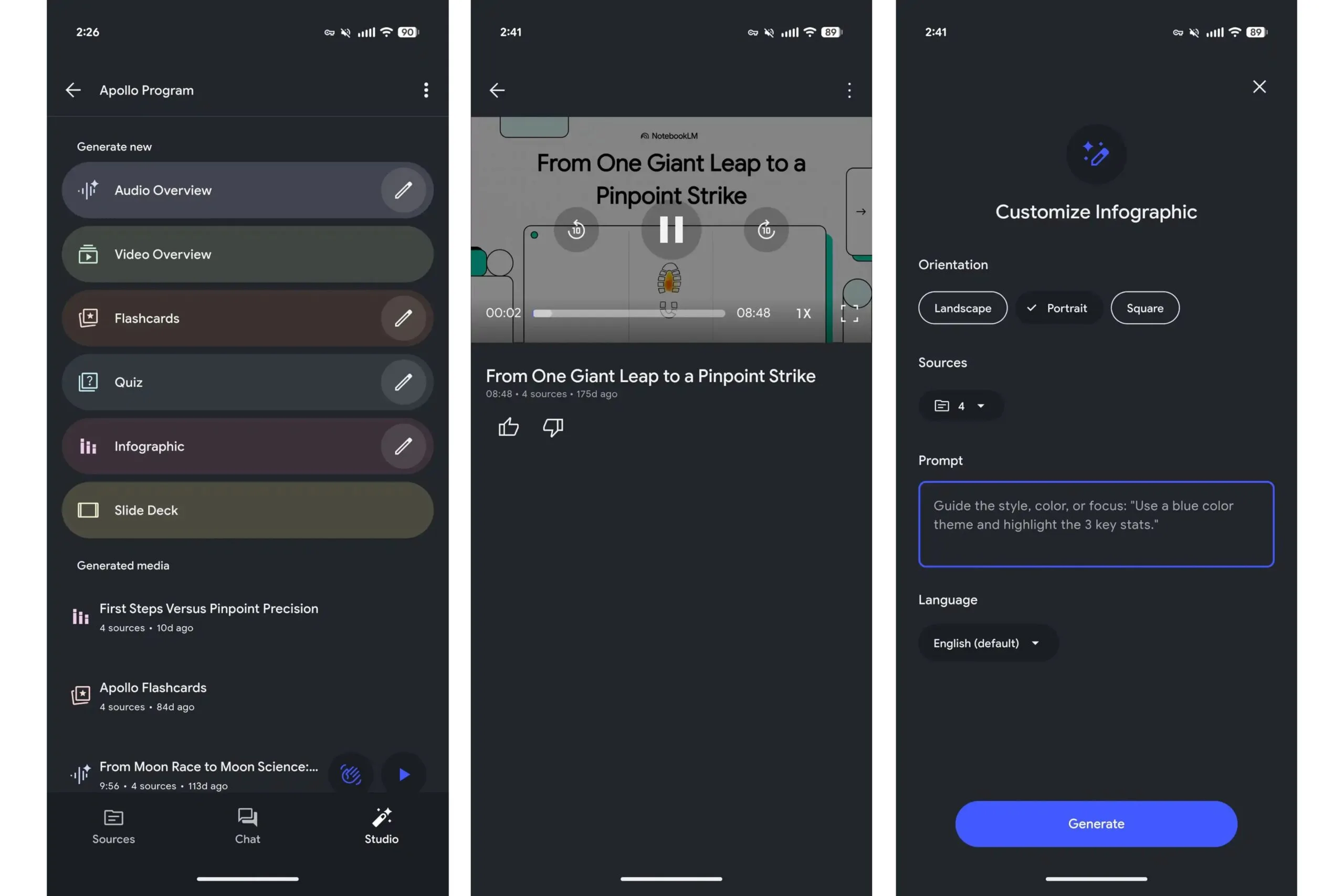 Dentro do aplicativo NotebookLM, você pode acessar a guia Studio para gerar visões gerais de vídeo diretamente de documentos. Esses vídeos transformam ideias-chave em recursos visuais narrados, combinando slides, destaques e diagramas.
