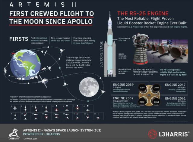 O SLS de 5,75 milhões de libras está equipado com quatro motores RS-25, três dos quais são motores principais atualizados de ônibus espaciais, enquanto um motor fará sua estreia no lançamento. A divisão Aerojet Rocketdyne da L3 Harris Applied sciences construiu os motores para o icônico programa de ônibus espaciais da NASA, que funcionou de 1981 a 2011. Cada motor já desempenhou um papel no programa de ônibus espaciais e agora ajudará a impulsionar o próximo salto da NASA para a Lua.