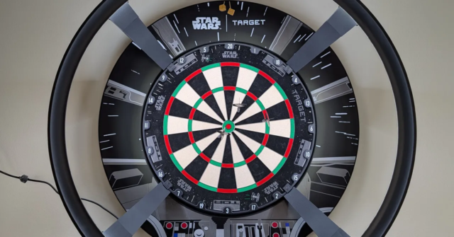 O Goal Darts Omni Auto Scoring System emparelha com o aplicativo DartCounter (Android ou iOS). É rápido e fácil de montar, prendendo-se à placa por meio de pernas magnéticas, mas você precisará conectar o cabo de alimentação a uma tomada. Conecte-se ao Wi-Fi, execute uma breve calibração e é hora de jogar. Eu testei com Goal Star Wars Millennium Falcon Surround e alvo de dardos (US$ 200 ou £ 150) e um conjunto de Dardos Darth Vader ($ 340 ou £ 250) – ambos presentes incríveis de Star Wars para os fãs da sua vida – mas devem funcionar com a maioria das pranchas e dardos.
