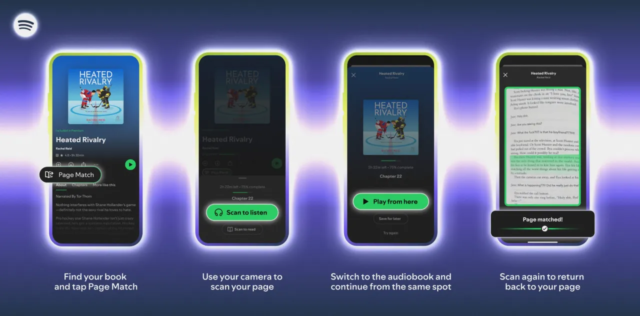 O Web page Match torna mais fácil passar de uma página de um audiolivro para a mesma página de um livro físico – e vice-versa. Ao digitalizar a página de um livro impresso ou e-book, os usuários podem navegar facilmente até essa página nos audiolivros do Spotify.
