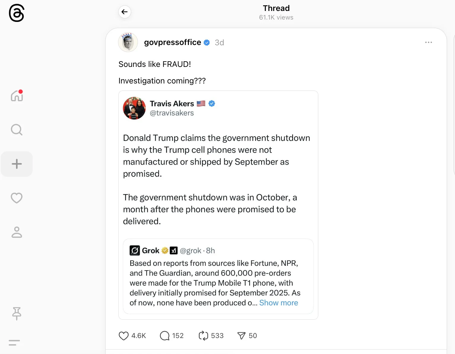 O fato é que ainda não temos dados reais e confiáveis sobre quantas pessoas, se houver, realmente gastaram dinheiro no T1, assim como não temos nenhuma prova actual e tangível da existência do telefone. O momento desse número inverificável com certeza é alguma coisa. Ainda esta semana, legisladores democratas instaram a FTC para examinar as “táticas de isca e troca” do Trump Cell, especialmente em torno de sua agora renegada promessa de fabricar o telefone T1 nos EUA. Caso você tenha perdido, um telefone fabricado nos EUA com a descrição do T1 é na verdade, tipo… nem é possível.