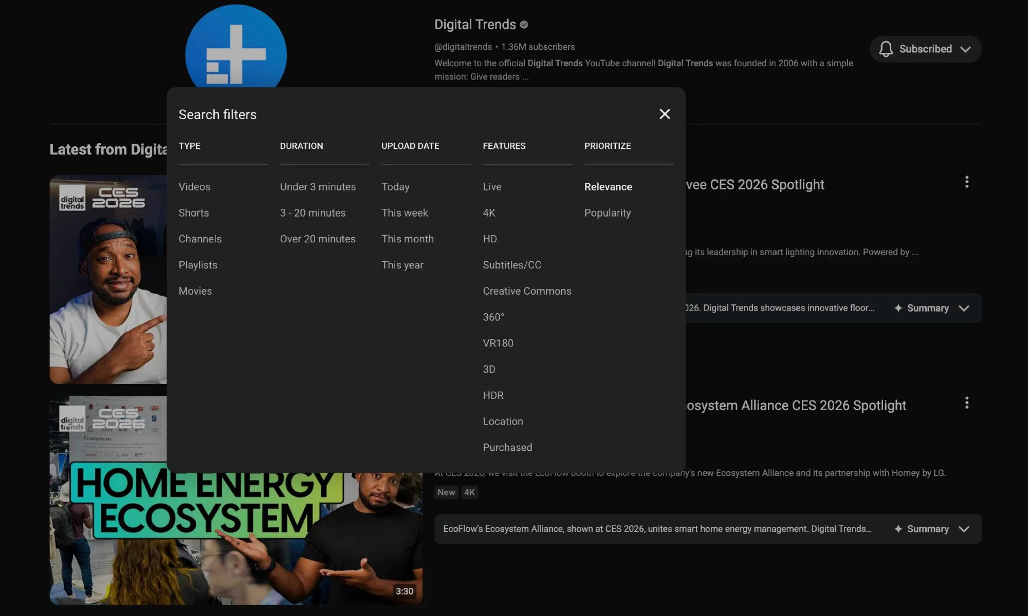 O menu Classificar por foi renomeado para “Priorizar” e agora inclui uma opção “Popularidade” em vez de “Contagem de visualizações”. O YouTube afirma que esta nova opção foi projetada para ajudar os usuários a localizar vídeos populares relacionados aos seus resultados de pesquisa, avaliando a contagem de visualizações do vídeo e “outros sinais de relevância, como o tempo de exibição, para determinar sua popularidade para aquela consulta específica”.