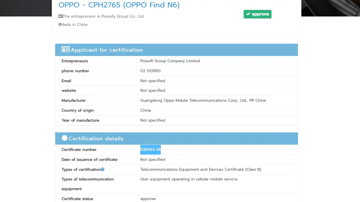 O não anunciado Oppo Discover N6 está listado no website da Nationwide Broadcasting and Telecommunication Fee (NBTC) com o número de modelo CPH2765. A listagem mostra que o smartphone suporta redes GSM, WCDMA, LTE e NR, o que confirma a presença de conectividade 4G e 5G. O aparelho é fabricado na China e está listado com o número de certificação B38063-26.