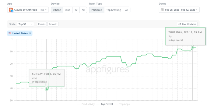 Os anúncios do Tremendous Bowl da Anthropic – que apresentam cenários sombrios e cômicos de pessoas que buscam conselhos de chatbots, apenas para serem direcionados a websites de namoro “puma” e palmilhas que aumentam a altura – estão dando resultado. Desde então, o chatbot de IA da Anthropic, Claude, subiu do 41º lugar na App Retailer dos EUA para se tornar um dos 10 melhores aplicativos. Na sexta-feira, Claude ocupava a 7ª posição – a classificação mais alta até o momento – sugerindo que seu discurso “sem anúncios” ressoa fortemente entre os usuários.