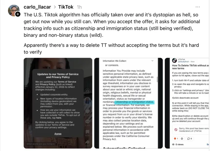 Por causa do alerta no aplicativo programado para o fechamento do negócio (uma exigência por causa da nova entidade authorized), muitas pessoas estão lendo os termos do TikTok pela primeira vez. Vendo esta linguagem e temendo o pior, eles estão postar nas redes sociais sobre suas preocupações e alertar os outros; alguns estão até ameaçando excluir suas contas.