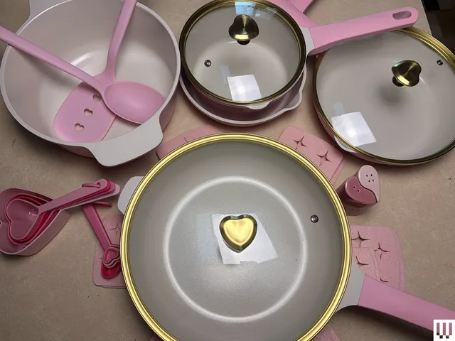 As panelas e frigideiras são muito, muito fofas, com revestimento antiaderente de cerâmica brilhante, corpo rosa e alças douradas em formato de coração nas tampas. O antiaderente teve um bom desempenho. (O fabricante recomenda usar fogo baixo ou médio, mas testei em fogo alto também.) Os ovos se soltaram sem deixar vestígios e o queijo americano derretido foi fácil de raspar.
