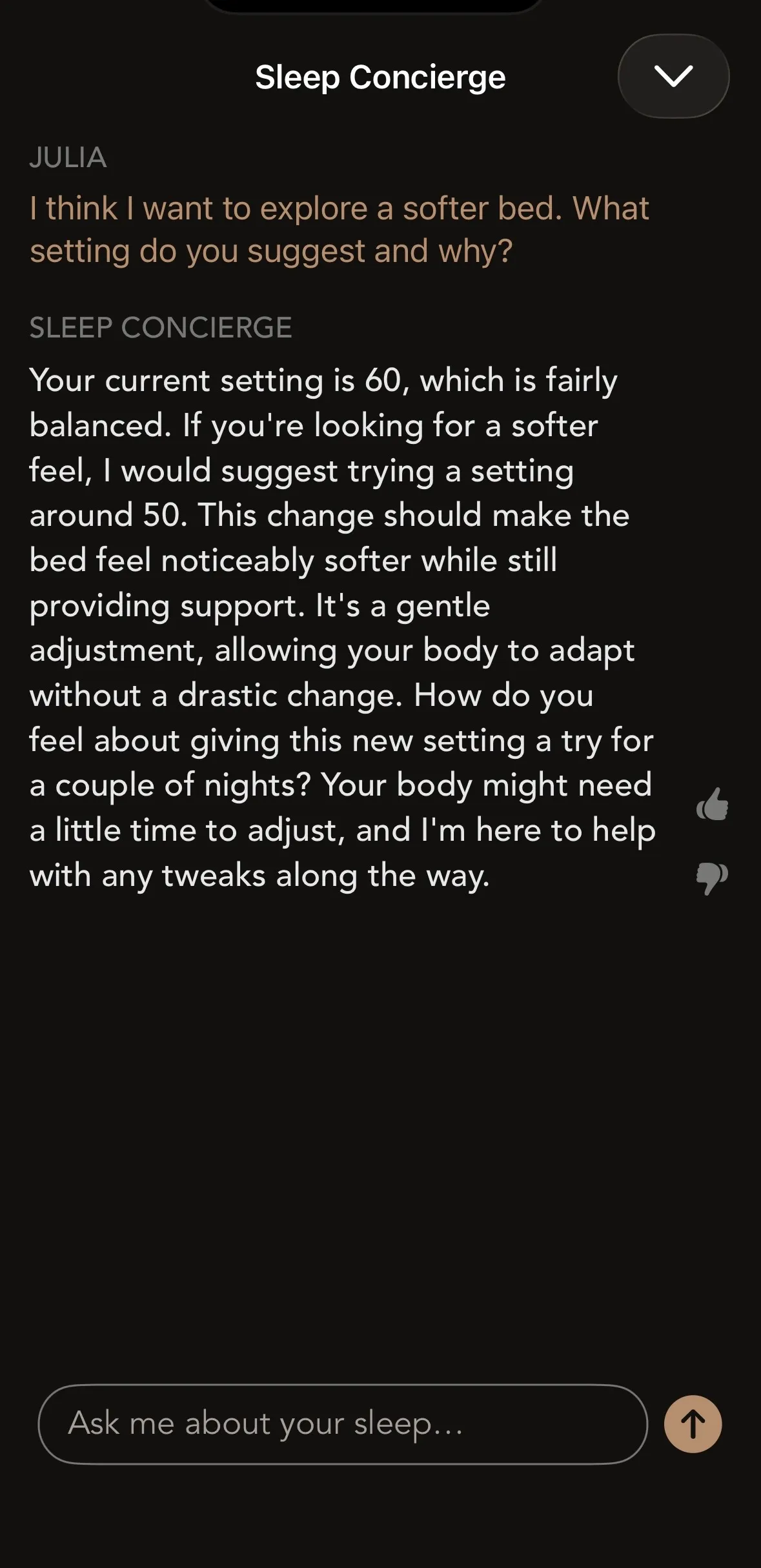 Existem 100 níveis de firmeza para escolher com o Stability Professional, e ele também apresenta a camada superior de espuma viscoelástica mais macia de todas as suas ofertas de colchões. Acabei me inclinando para níveis mais firmes para compensar essa suavidade, chegando aos 60, enquanto meu marido optou pelos 80. Demorou cerca de uma semana para ajustar nossas preferências e estabelecer uma linha de base, conforme o aplicativo Bryte descreveu durante a instalação.
