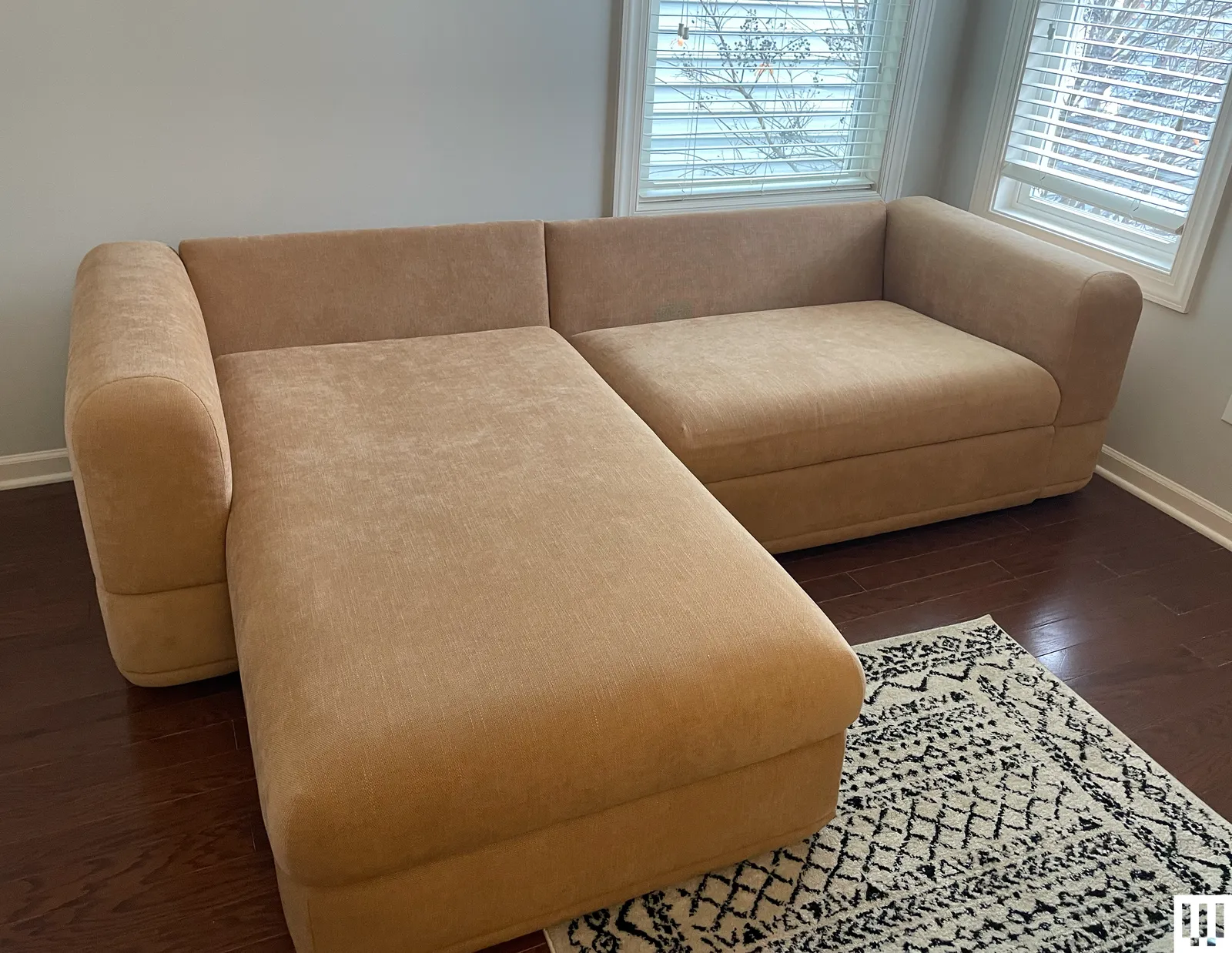 Em homenagem a todas as minhas experiências anteriores com sofá-cama, eu queria saber como o Wanda se sairia em uma sala pequena. Então, em vez da configuração recurring de um estúdio espaçoso, com dimensões de 13 por 15 pés, decidi usar meu escritório doméstico no andar de cima. Como não tirei minha mesa do caminho, a Wanda ocupou metade da sala, que tinha apenas 3,5 metros por 3,5 metros, mais ou menos, com outros móveis. O sofá-cama tem 99 polegadas de comprimento (8,25 pés) e lembra um “L” lateral, com a espreguiçadeira projetando-se 69 polegadas (5,75 pés). Como se isso não fosse aconchegante o suficiente, meu marido e dois cachorrinhos decidiram abrir uma loja comigo.