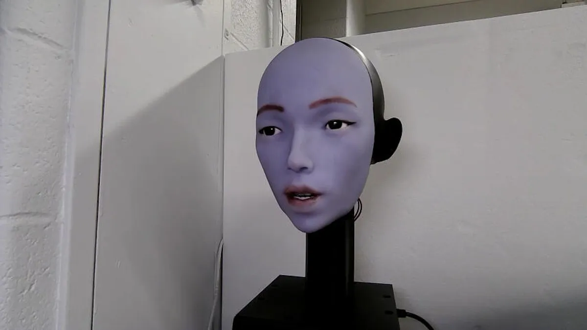 Pesquisadores da Universidade de Columbia fizeram com que a boca desse rosto de robô parecesse realista cantando letras geradas por IA.