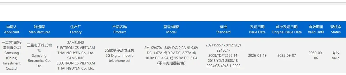 O próximo Samsung Galaxy S26+ está listado no web site da 3C com o número de modelo SM-S9470. A listagem indica que ele suportará carregamento rápido com fio de 45 W (4,5 A ou 15,0 V DC), combinando com o Galaxy S25 +. A Samsung parou de enviar carregadores com seus smartphones a partir do Galaxy S21 em janeiro de 2021, um ano depois da rival Apple.