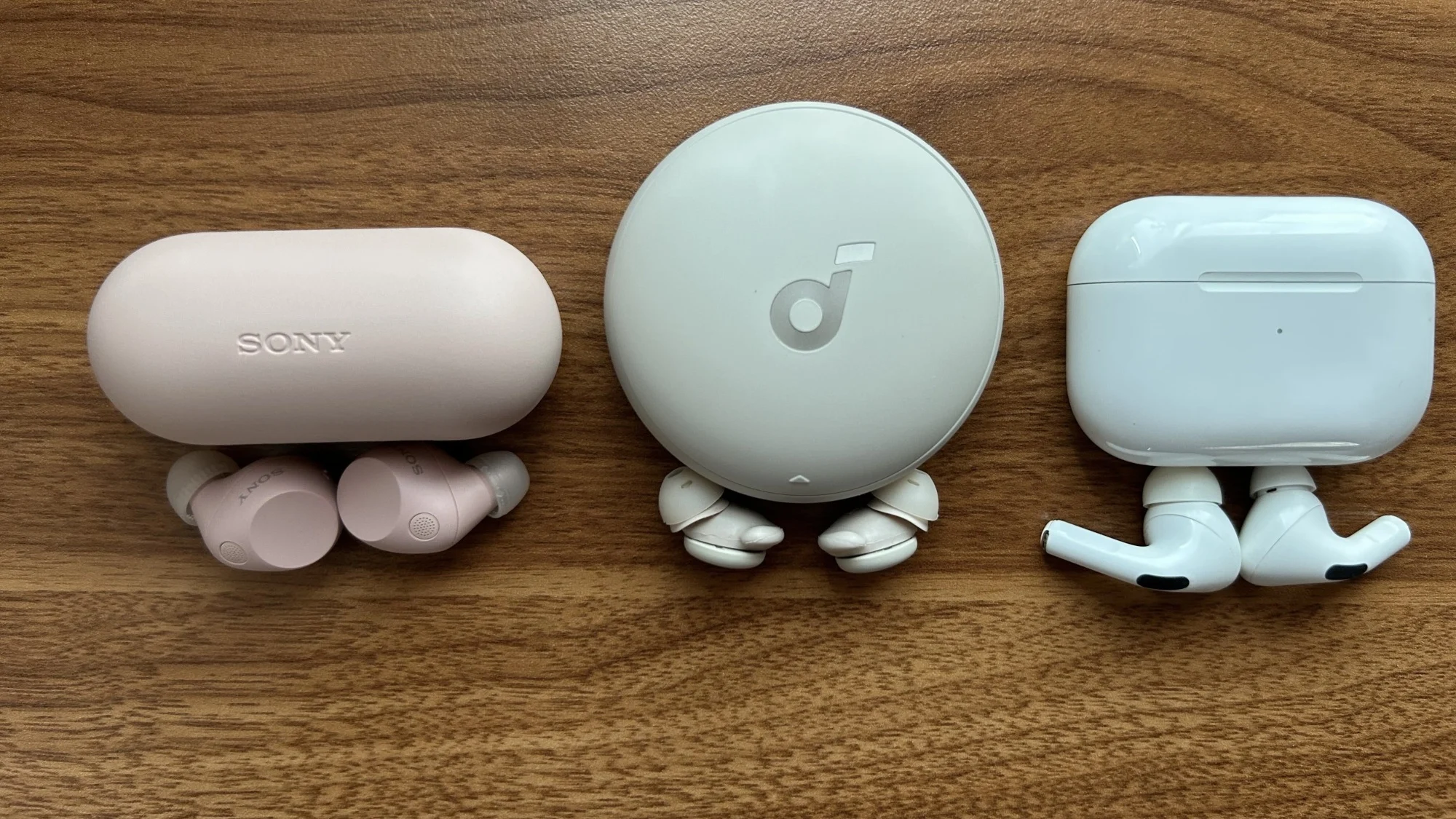 Os fones de ouvido para dormir, como os Soundcore A20 mostrados no meio, têm um perfil muito mais fino do que os fones de ouvido tradicionais.