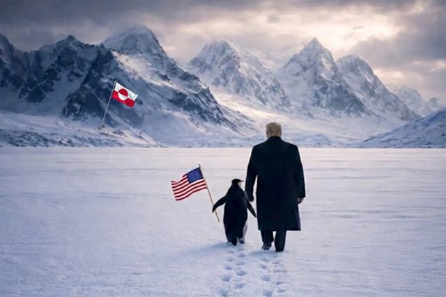 Trump foi mais explícito sobre a ligação à Gronelândia noutras publicações, como uma da conta da Casa Branca X, de 23 de janeiro, que mostra uma imagem gerada por IA de um pinguim e Trump de mãos dadas. A bandeira da Groenlândia aparece ao fundo. O pinguim segura uma bandeira americana ao se aproximar, símbolo da conquista do país.