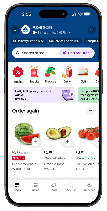 Os clientes podem inserir uma lista ou fazer add de uma imagem de uma, e o Cart Assistant adicionará automaticamente os itens necessários à cesta. Isso inclui fotos de listas manuscritas ou capturas de tela de receitas e seus ingredientes. Os usuários podem então personalizar a cesta trocando itens por marcas preferidas ou adicionando mais produtos da loja.