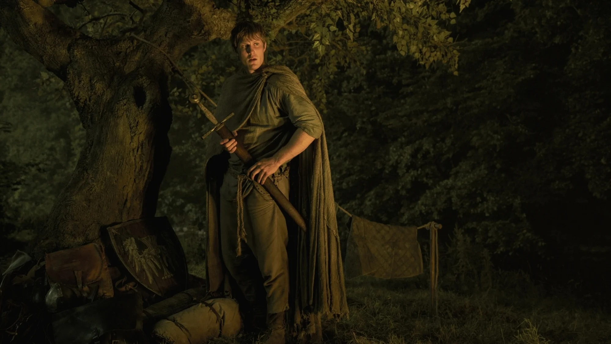 “Tenho que dormir nas sebes porque nenhum senhor quer”, ela continua, referindo-se ao fato de que “verdadeiros cavaleiros” que servem as grandes casas e palácios de Westeros vivem entre a aristocracia ou em suas próprias terras concedidas. Dunk dorme sob as estrelas acampando todas as noites, enquanto pessoas como Ser Lyonel Baratheon (Daniel Ings) têm um pavilhão de luxo completo e terras para onde retornar.