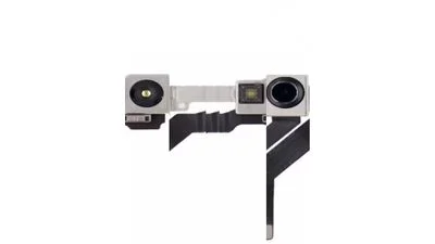 A imagem mostra o que parece ser um conjunto de sensor de identificação facial vazado composto por três módulos distintos montados em um único cabo flexível: um iluminador infravermelho à esquerda e um projetor de ponto centralizado com uma câmera infravermelha à direita.