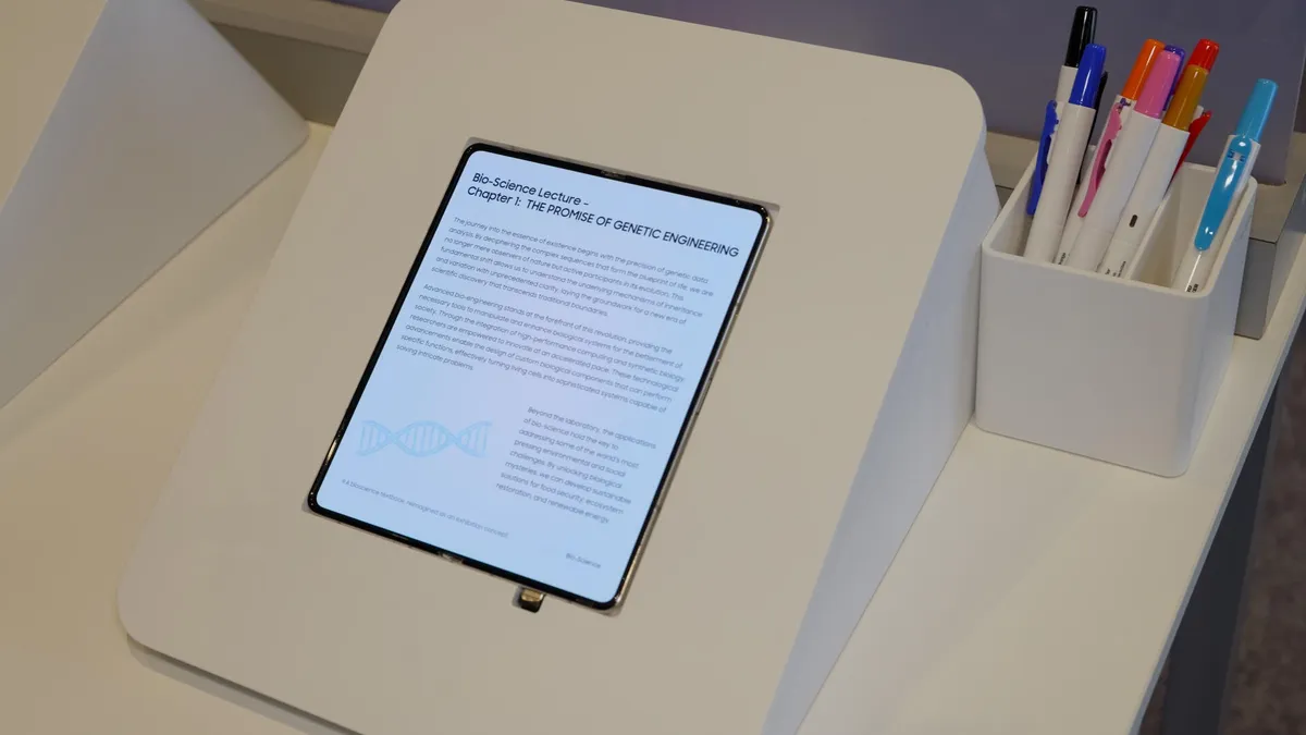 A empresa colocou dois modelos de telefone lado a lado: um que foi simplesmente apelidado de dispositivo “atual” (o Samsung Show não confirmou se é o Galaxy Z Fold 7) e outro que é um conceito. Olhando para os dois telefones, a diferença foi impressionante. Ao visualizar a tela conceitual diretamente e em ângulo, não consegui ver a linha central que caracteriza os dobráveis atuais. O telefone atual parecia instantaneamente desatualizado.