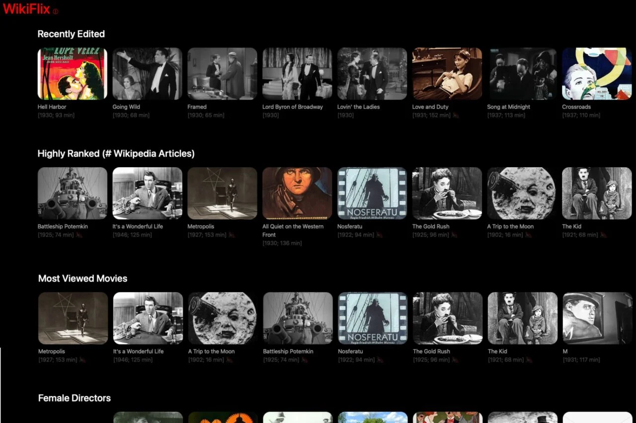 A chegada de uma nova parcela de obras de arte ao domínio público significa coisas diferentes para pessoas diferentesmas talvez o benefício mais imediato seja que isso significa que há uma nova lista de filmes clássicos que você pode assistir gratuitamente. E, felizmente, há um recurso dedicado especificamente a disponibilizar filmes de domínio público para assistir on-line: WikiFlixqual baseia-se Wikimedia Commons, Web Archive e YouTube, e fornece um native conveniente para assistir vídeos de todas as três fontes.