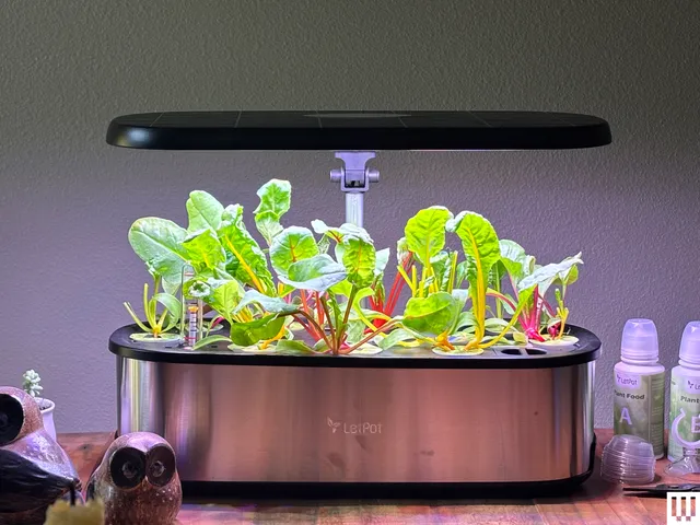 LPH-SE Senior 12-pod, yang ditampilkan dalam panduan berkebun dalam ruangan saya, telah menjadi teman meja yang dapat dipercaya selama beberapa bulan sekarang, menghasilkan baby chard organik yang dapat dipotong setiap beberapa hari untuk salad segar. (Makanan tidak lebih bersifat lokal daripada sayuran yang ditanam beberapa inci dari piring makan Anda!)