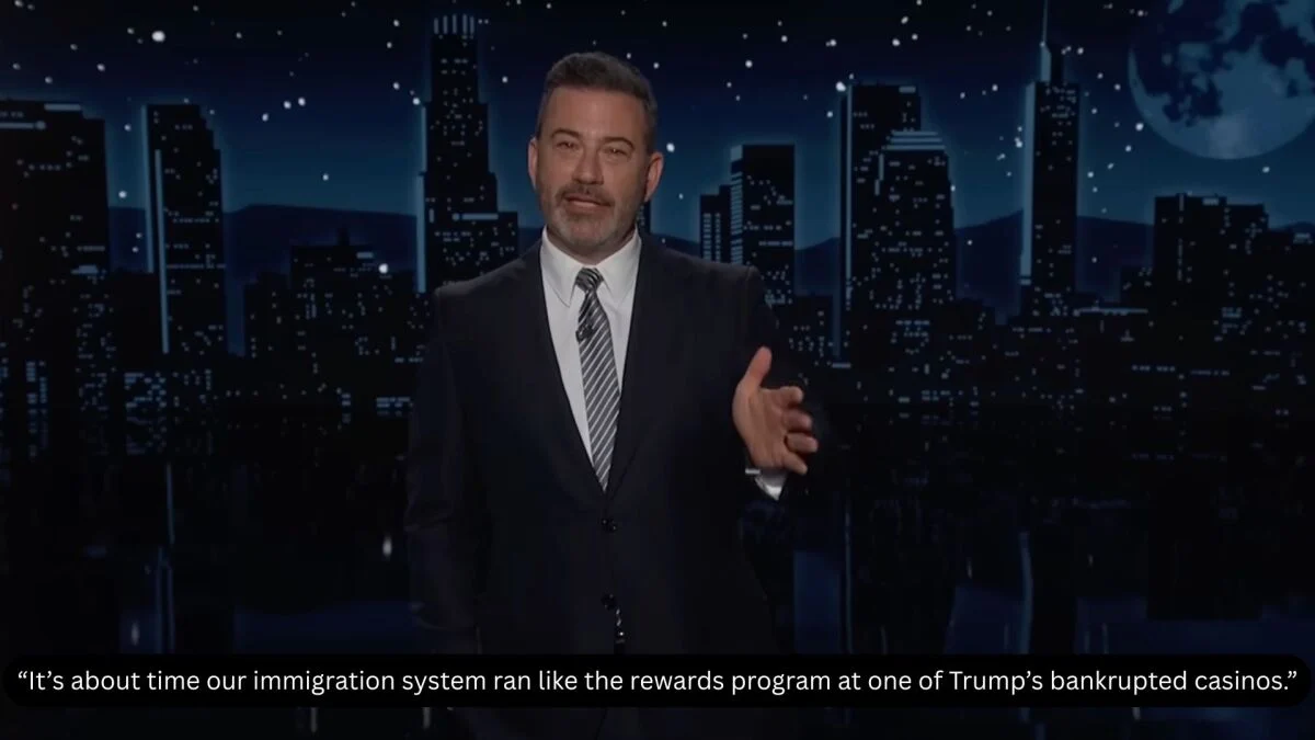 “Benar, orang terbaik adalah orang kaya,” kata Kimmel. “Itu yang selalu Yesus katakan. Itu ada di dalam Alkitab, katanya lebih mudah bagi seekor unta untuk melewati lubang jarum jika Anda membayar jarum suntik satu juta dolar. Orang kaya adalah orang-orang terbaik yang pernah ada, itulah sebabnya Tuhan membuat mereka kaya. Dan saya katakan sudah saatnya sistem imigrasi kita berjalan seperti program hadiah di salah satu kasino Trump yang bangkrut.”
