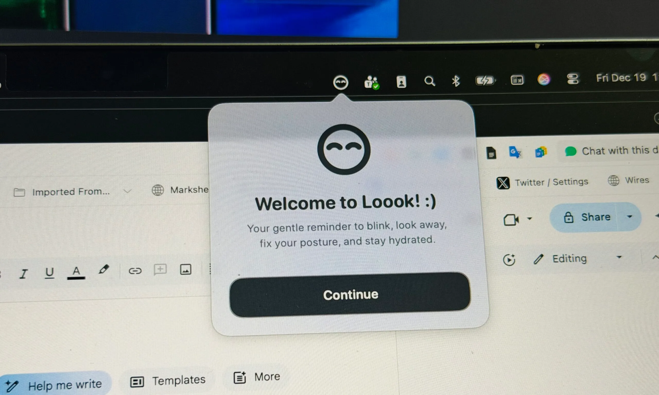 Loook adalah aplikasi Mac yang menangani empat tugas inti. Ini mengingatkan Anda untuk menghidrasi diri sendiri. Ini memberitahu Anda untuk mengalihkan pandangan dari layar sebentar. Ia meminta Anda untuk memberikan sedikit kelegaan pada mata Anda yang terbakar piksel dengan berkedip. Dan yang lebih penting, ini memberikan dorongan berkala untuk memperbaiki postur tubuh Anda.