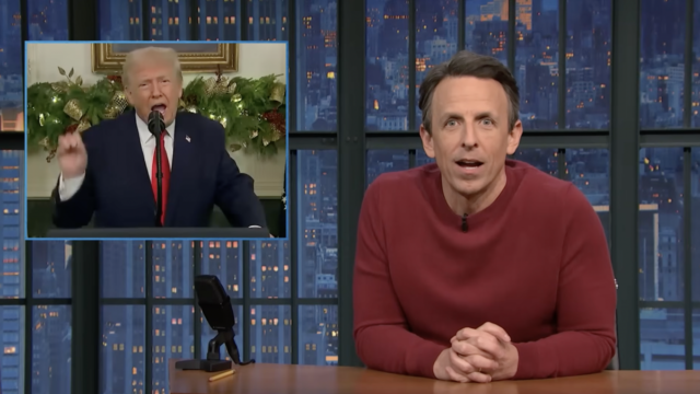 Donald Trump berteriak pada menit ke-18 alamat jam tayang utama dari Gedung Putih pada Kamis malam sambil dikelilingi oleh pohon Natal. Dan seperti Stephen Colbert dan Jimmy Kimmel, Seth Meyers membongkar semuanya.